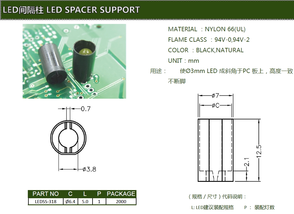 LED間隔柱LEDSS-318,保護?5mmLED燈柱立于PC板上,使高度一致,LED燈柱不斷腳,有遮光效果,不漏光。
