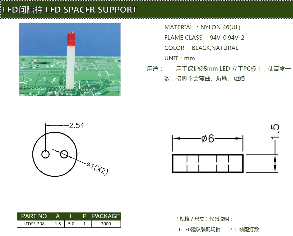 LED間隔柱LEDSS-338,保護?5mm的LED燈柱立于PCB板上,使LED燈柱高度一致,LED燈接腳不會彎曲、折斷、短路。