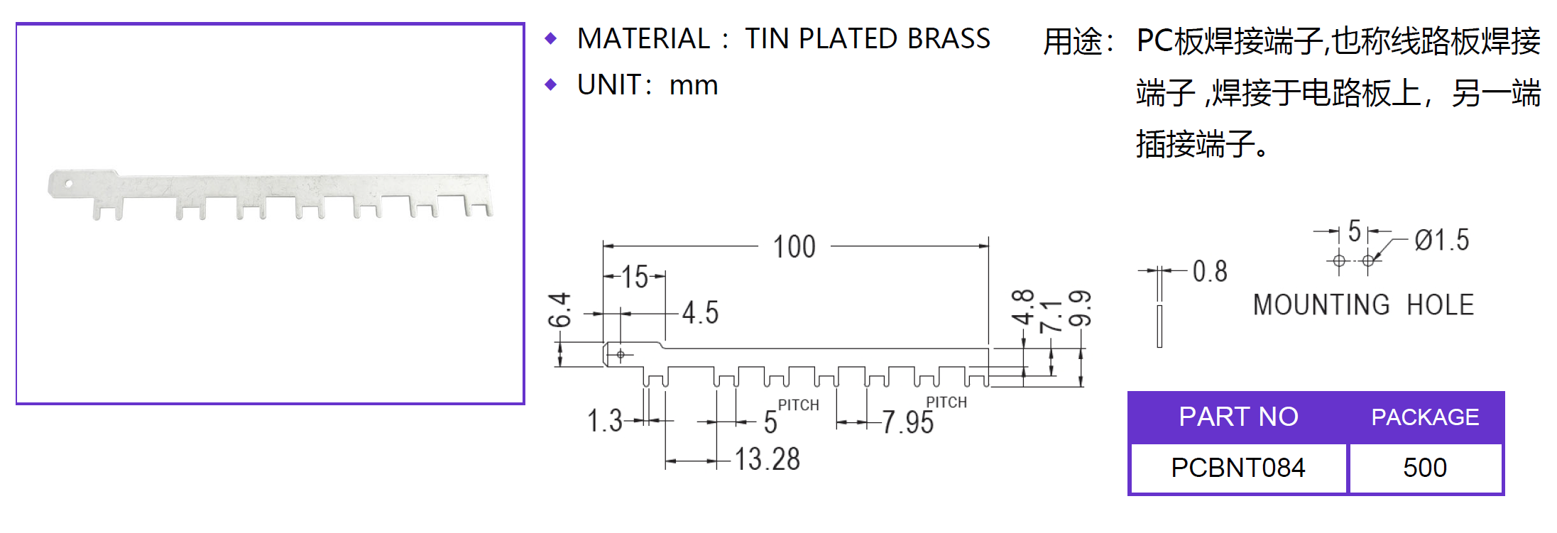 PC板焊接端子,也稱線路板焊接端子 ,焊接于電路板上,另一端插接端子。