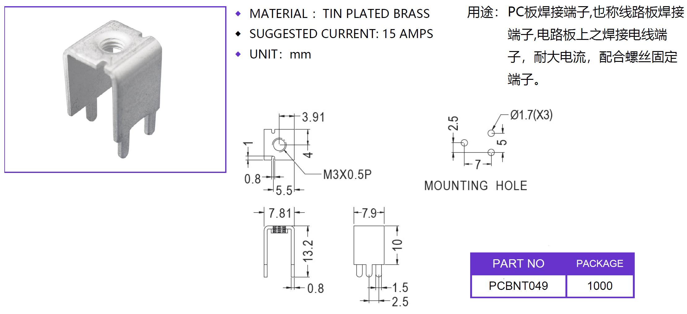 PC板焊接端子,也稱線路板焊接端子 ,電路板上之焊接電線端子,耐大電流,配合螺絲固定端子。