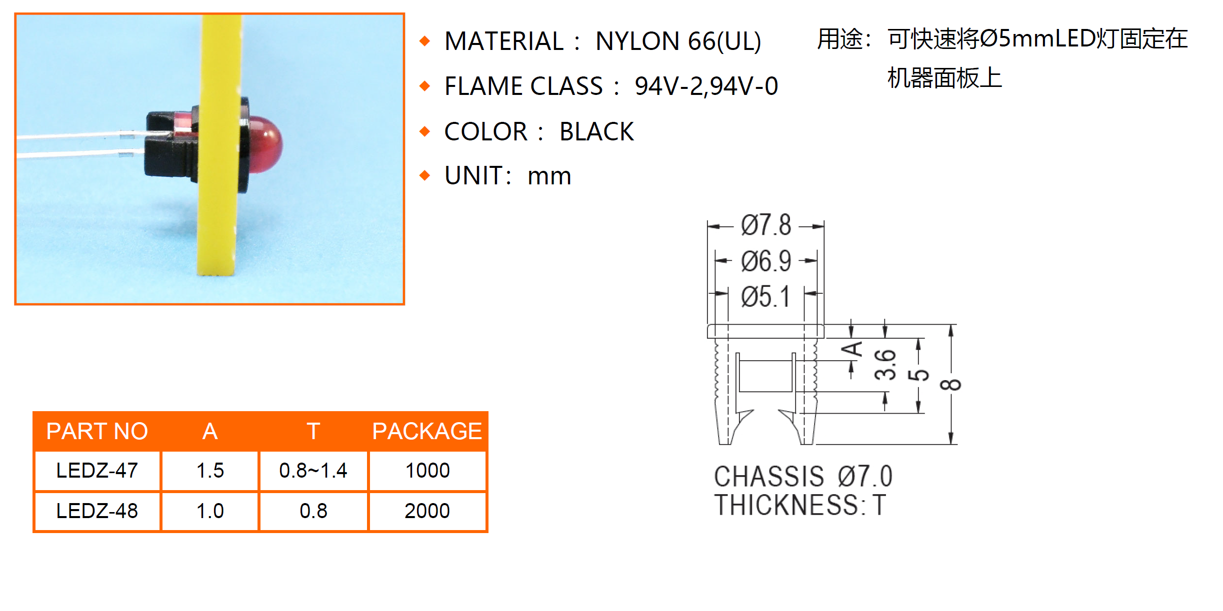 可快速將?5 LED固定于機器面板上。