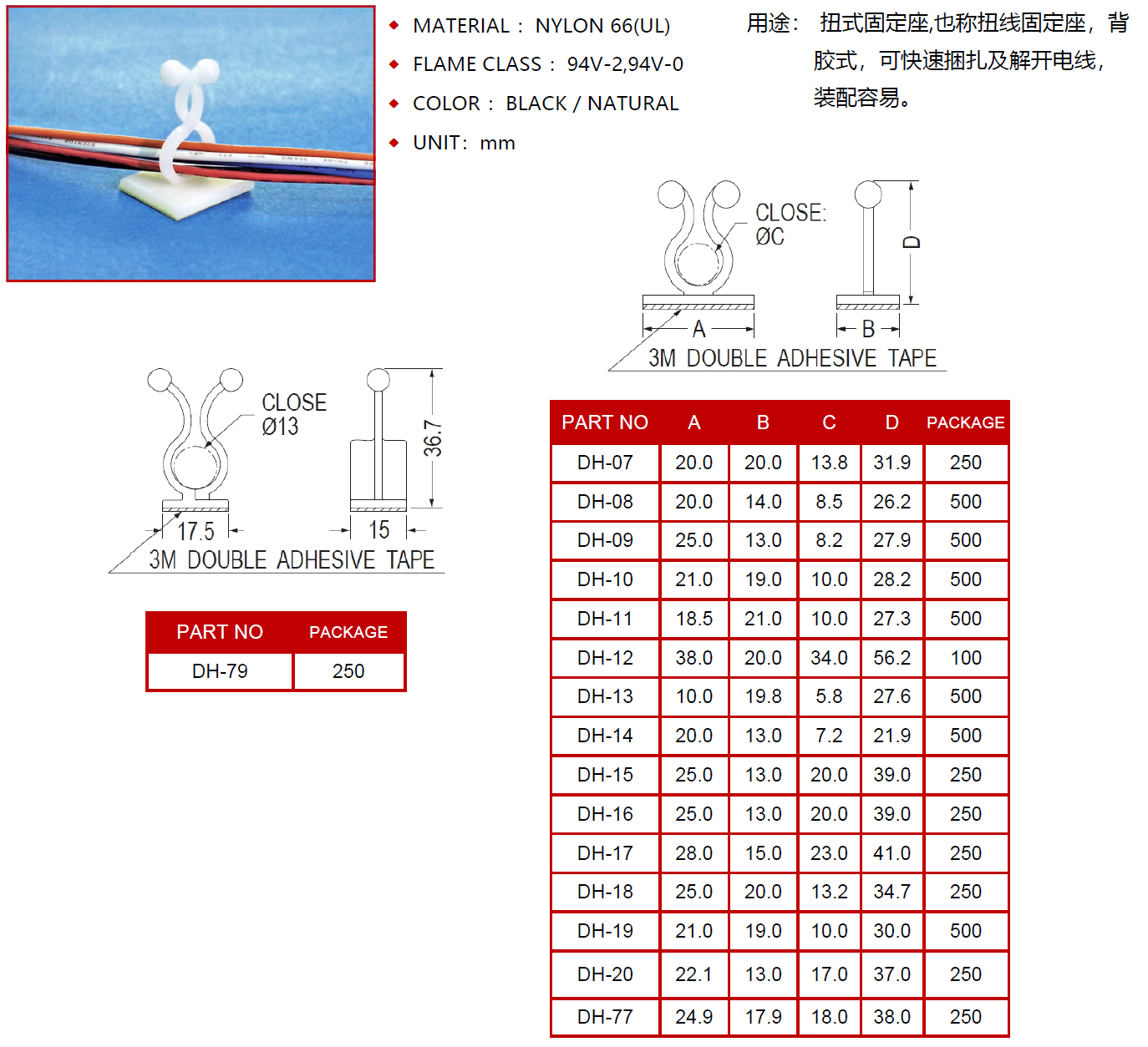 DH-07、DH-08、DH-09、DH-10、DH-11、DH-12、DH-13、DH-14、DH-15、DH-16、DH-17、DH-18、DH-19、DH-20、DH-77、DH-79?Twist Lock?Twist Ties?背膠式?扭線固定座