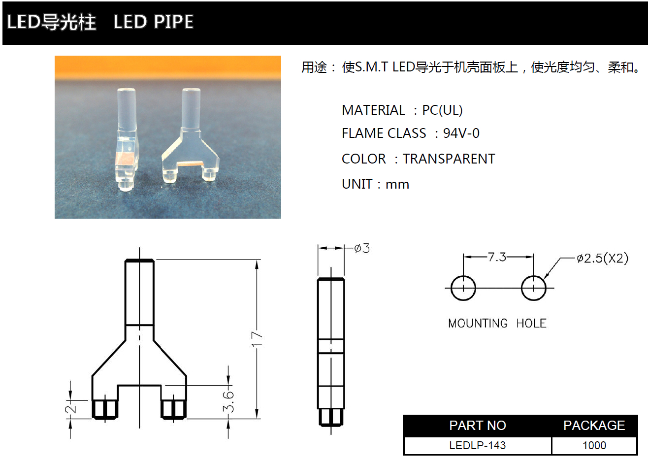 LED導(dǎo)光柱LEDLP-143,將S.M.T LED燈柱導(dǎo)光到機(jī)箱面板上,使S.M.T LED燈柱亮度均勻、柔和。