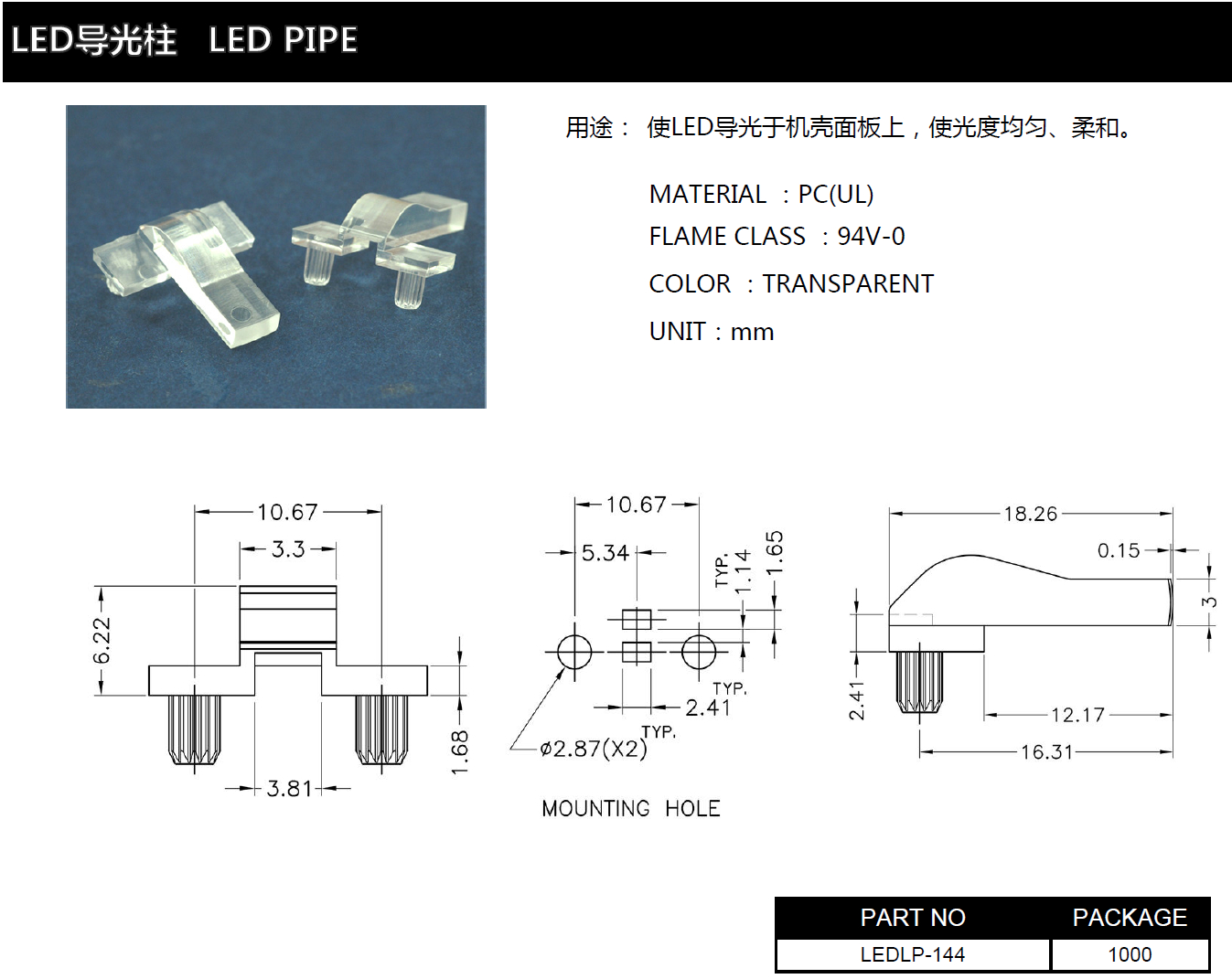 LED導(dǎo)光柱LEDLP-144,將S.M.T LED燈柱導(dǎo)光到機(jī)箱面板上,使S.M.T LED燈柱亮度均勻、柔和。