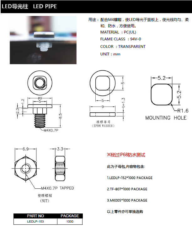 LED導(dǎo)光柱LEDLP-153,配合M4螺帽,使LED燈柱導(dǎo)光到面板上,使LED燈柱光線均勻、柔和、防水,方便使用。