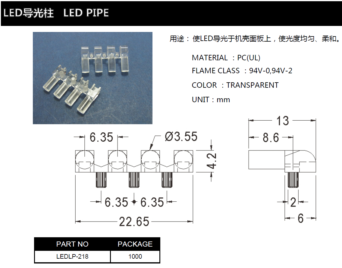 LED導(dǎo)光柱LEDLP-218,將LED燈柱導(dǎo)光到機箱面板上,使LED燈柱亮度均勻、柔和。